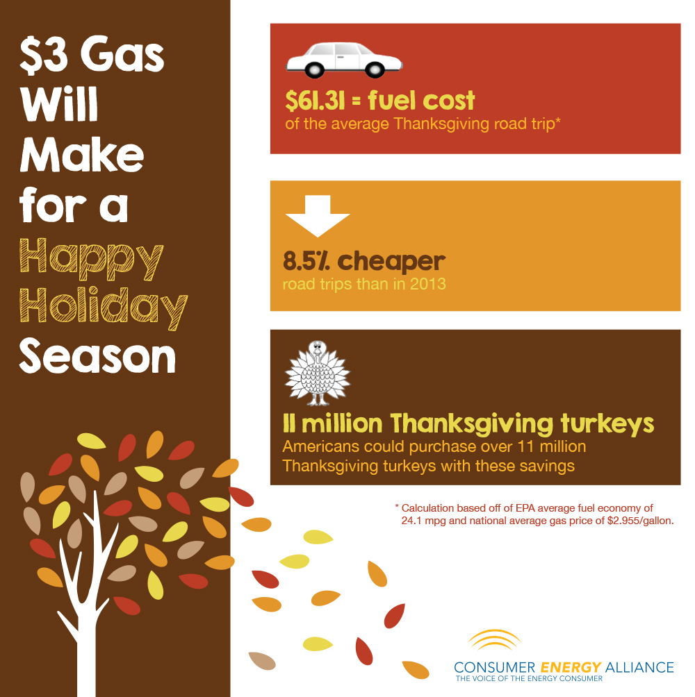 According to AAA, U.S. energy consumers are spending $250 million less each day than they were this summer when gas prices peaked at $3.68 per gallon. Lower gas prices mean that American consumers will have cash to put toward another present at Christmas or more groceries at Thanksgiving. In fact, that extra $250 million in the pockets of American consumers could purchase more than 11 million Thanksgiving turkeys!