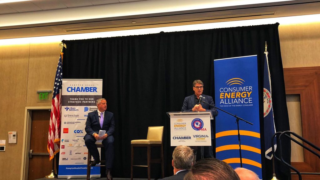 NORFOLK, V.A. — Domestic energy production and expansions in infrastructure continue to be a must-have for American energy dominance and national and economic security, benefitting American families, small businesses and the environment, including those in Virginia, U.S. Secretary of Energy Rick Perry said today at an energy and security summit hosted by Consumer Energy Alliance (CEA) in Norfolk, V.A.