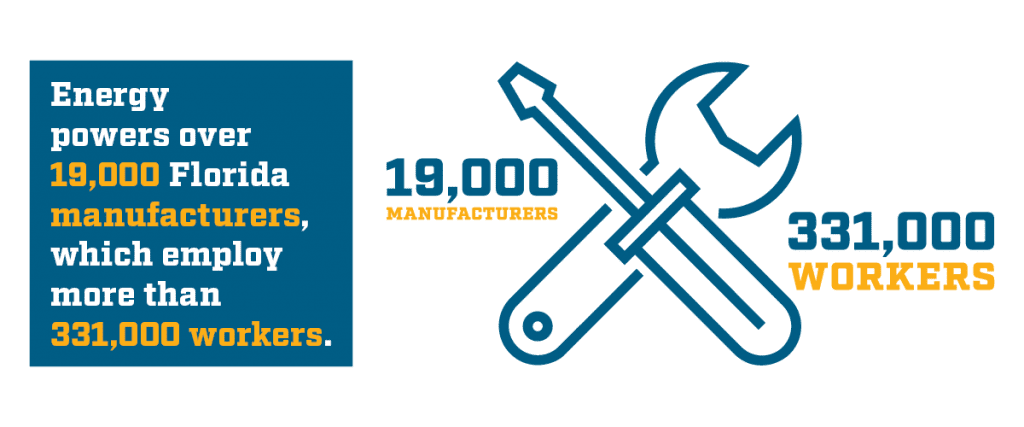 Energy is not only needed to manufacture parts for rocket ships and airplanes, it’s also needed to support Florida’s manufacturing industry in general. The state is home to over 19,000 manufacturers, employing more than 331,000 workers.6 It’s not just the aerospace and aviation industry that makes and produces things here; Florida’s manufacturing industry is very diverse and includes companies in traditional manufacturing industries, such as electronics, plastics, food processing, and printing. This means that without energy, Florida would be unable to produce its famous orange juice or cotton for clothing, parts for fishing boats and fishing rods,7 or your reliable Tervis tumbler.8 Without energy and the derivatives that come from it, Florida would also be unable to contribute the breakthrough technologies that manufacturers bring to life, such as lasers, photonics, and medical devices.
